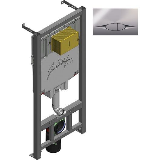 Система инсталляции для унитазов Jacob Delafon E29025-NF крепится в капитальную стену и пол, и предполагает экономичный расход воды благодаря двухкнопочному смывному бачку с возможностью выбора между полным (6 литров) и частичным (3 литра) сливом. Подвод воды осуществляется сверху, а диаметр слива составляет 9 см. Габариты рамы: монтажная глубина 23,5 см, высота 109 см; межосевое расстояние под крепежные шпильки — 18/23 см. Комплектуется смывным бачком и хромированной кнопкой смыва Jacob Delafon E29027-CP, которая выполнена из пластика и имеет размеры 23x15 см с глубиной 3,2 см. Страна производства — Франция, гарантия на систему инсталляции составляет 10 лет, а на кнопку смыва — 5 лет.