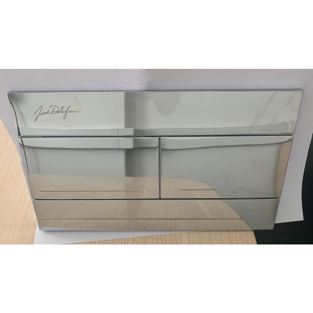 - Кнопка смыва Jacob Delafon E4316-CP: Компактные габариты 25.5x15.1 см, глубина всего 0.8 см. Выполнена из пластика с хромированным глянцевым покрытием и оснащена двумя кнопками для полного и частичного слива.