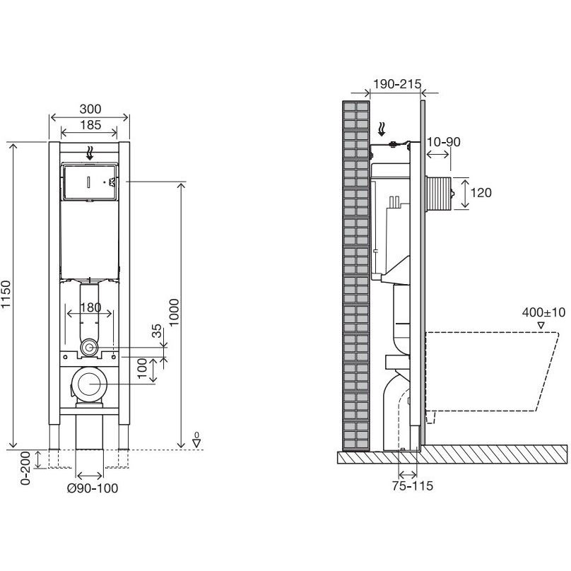 - Система инсталляции Jacob Delafon E33130RU-NF: Крепится в капитальную стену и пол, имеет смывной бачок объемом 3 и 6 литров, возможность подвода воды сверху и сзади. Общая высота установки составляет 115 см, монтажная глубина — 19 см, диаметр слива — 9 см, межосевое расстояние под крепежные шпильки — 18 см.