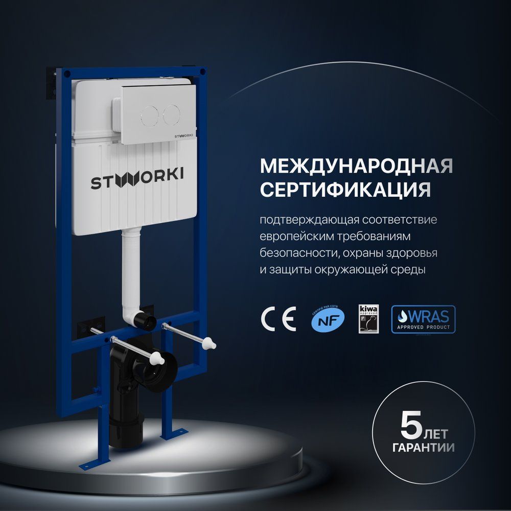 Перед приобретением системы инсталляции STWORKI 510162 следует учесть, что продукт адаптирован для установки в капитальные стены. Смывной бачок уже входит в комплект, что уменьшает затраты и упрощает монтаж. Гарантия на комплект составляет 5 лет, что свидетельствует о высоком качестве изделия и его надежности в эксплуатации.