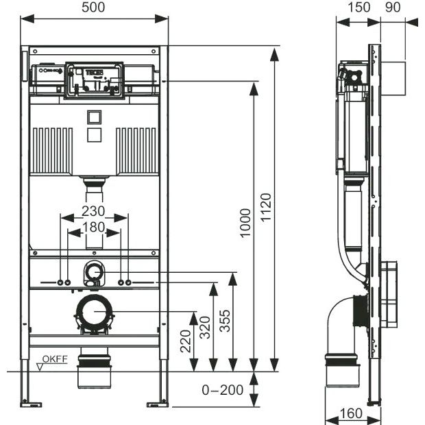 Система инсталляции оснащена бачком объемом 10 литров с предустановленным стандартным объемом смыва 6 литров. Объем смыва можно настроить — 4,5, 7,5 или 9 литров, а также предусмотрен малый слив на 3 литра для системы двойного смыва. Подвод воды возможен как сверху, так и сбоку, что обеспечивает дополнительную гибкость при установке. Диаметр слива составляет 9 см, а межосевое расстояние крепежных шпилек — 18 или 23 см, в зависимости от ваших потребностей.