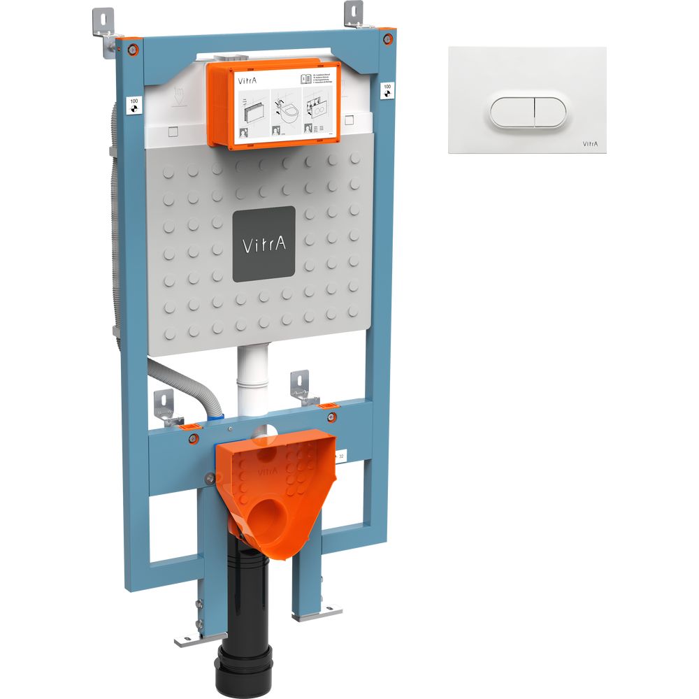 Система инсталляции для унитазов VitrA V8 крепится к капитальной стене и полу. Смывной бачок, объемом 3 и 6 литров, обеспеченный шумоизоляцией, позволяет сберечь воду. Диаметр слива составляет 9 см, монтажная глубина — 9 см, монтажная высота — 127 см, что делает установку подходящей для любых интерьеров. Представленная модель изготовлена в Турции и имеет гарантию на 10 лет, в комплект уже включены смывной бачок и белая глянцевая кнопка смыва VitrA Loop с двумя кнопками и размерами 24.4x16.5 см.