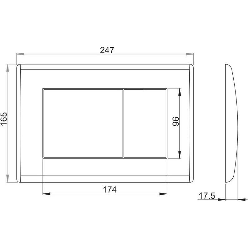 Кнопка выполнена из прочного пластика и совместима с различными моделями унитазов. Размеры составляют 24.7x16.5 см, а глубина — всего 1.75 см, что обеспечивает компактность и простоту установки. Изделие подходит для большинства современных систем инсталляции, предлагая как эстетичное, так и функциональное решение для ванной комнаты.