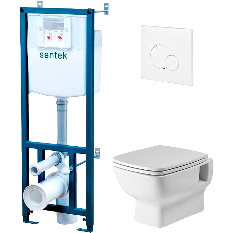 Комплект Santek Нео включает в себя всё необходимое для удобной и качественной установки: безободковый унитаз с надежным горизонтальным выпуском в стену и фарфоровой структурой, известной своей долговечностью. Крышка и сиденье выполнены из износостойкого дюропласта и оснащены системой легкого снятия для упрощенного ухода. Каскадный слив обеспечивает эффективное очищение чаши, а объем смыва 3 и 6 литров помогает экономить воду. В комплекте также присутствуют: смывная кнопка и бачок. Гарантия на керамическую часть и инсталляцию составляет 10 лет, на сиденье и кнопку смыва – по 3 года.