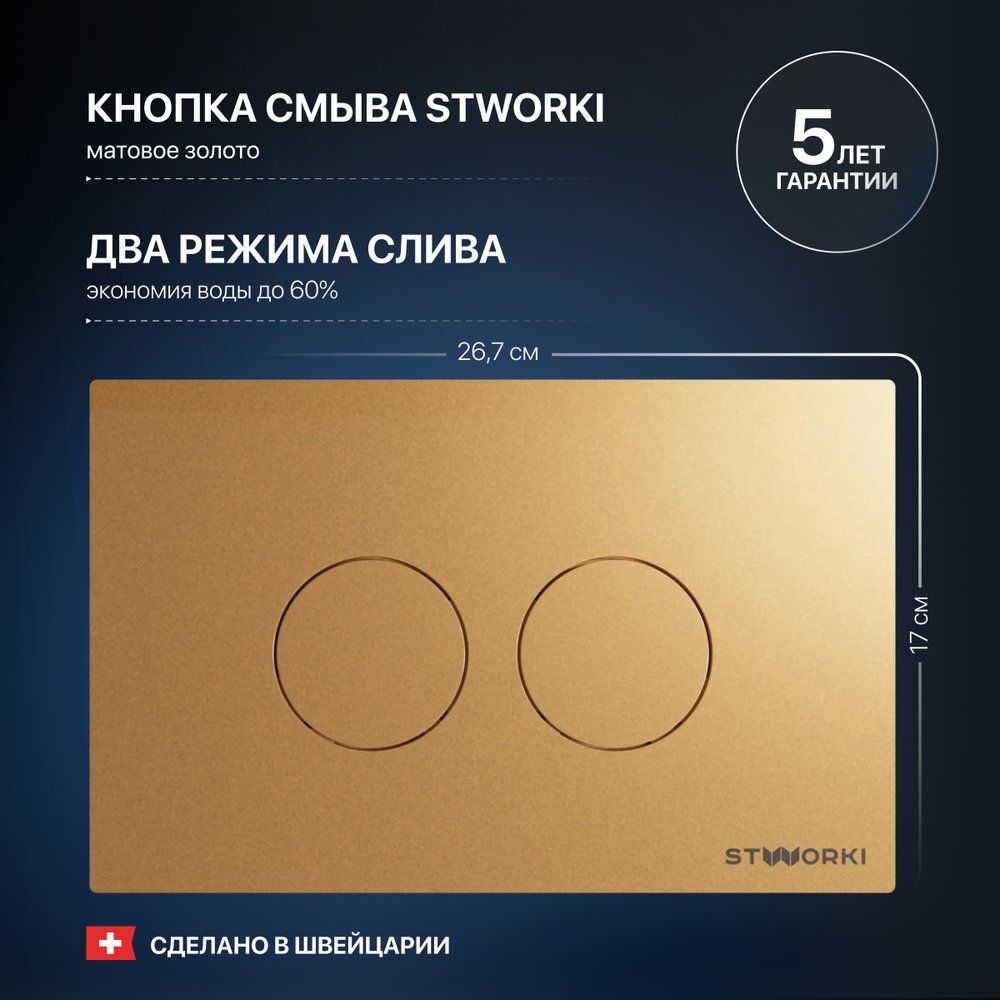 Инсталляция STWORKI 510162 легко крепится к капитальной стене и полу, оснащена ультратонким бачком и поддерживает экономичный режим слива, регулируемый двумя кнопками для полного и частичного смыва.