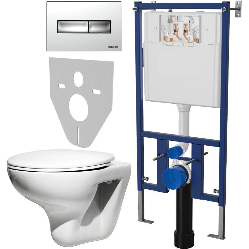 Современная чаша подвесного унитаза Roca Mateo отличается стильным дизайном, длиной 43 см и крепится горизонтально в стену. Изготовленная из высококачественного фаянса, она длительный период сохраняет свой блеск. Крышка-сиденье DIWO Матео 0346 изготовлена из термопласта, обеспечивая долговечность и комфорт. Система инсталляции для унитазов DIWO 4501 легка в монтаже, устойчива к коррозии и сохраняет работоспособность течение 50 лет. Кнопка смыва DIWO 7322 хром выполнена их пластика, предусматривающая экономный расход воды за счет двойного режима слива.