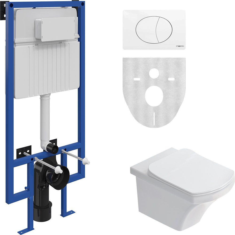 Унитаз подвесной STWORKI с горизонтальным выпуском монтируется в стену, завершен ультратонким дюропластовым сиденьем, которое не подвержено пожелтению и царапинам. Инсталляция STWORKI 510162 предназначена для крепления в капитальную стену и пол, конструкция включает механическую кнопку смыва с экономным режимом. Высота монтажа составляет 104,5 см, а глубина – 12 см. Бесшовный бачок прошел сертификацию известными стандартами CE, NF, KIWA и WRAS. Система оснащена звукоизолирующей прокладкой и дополнительными ребрами жесткости для надежности. Кнопка смыва белого цвета выполнена из пластика, с двумя кнопками для разных режимов смыва.