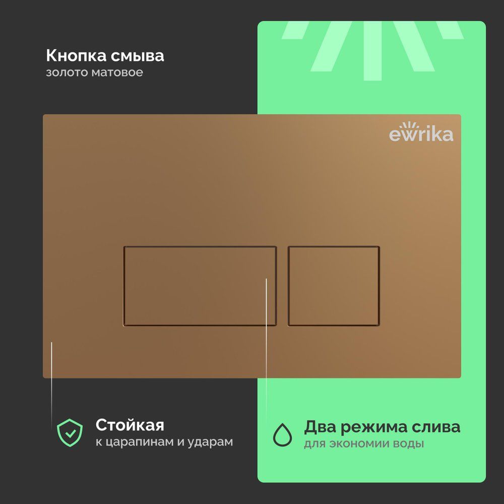 Кнопка смыва EWRIKA 0043 в золотом матовом исполнении, легкая в монтаже и долговечная, рассчитана на более чем 100 000 нажатий. Поверхность кнопки спроектирована так, чтобы на ней не оставались отпечатки пальцев.