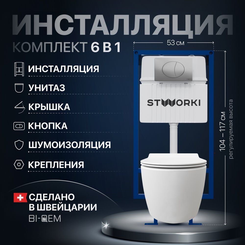 Откройте для себя идеальное сочетание функциональности и дизайна с комплектом инсталляции STWORKI Ноттвиль SETK3104-2616. Этот набор объединяет в себе изысканный подвесной унитаз без ободка, современную инсталляцию и стильную кнопку смыва в хромовом матовом исполнении. Каждая деталь тщательно продумана, чтобы сделать вашу ванную комнату настоящим оазисом комфорта.