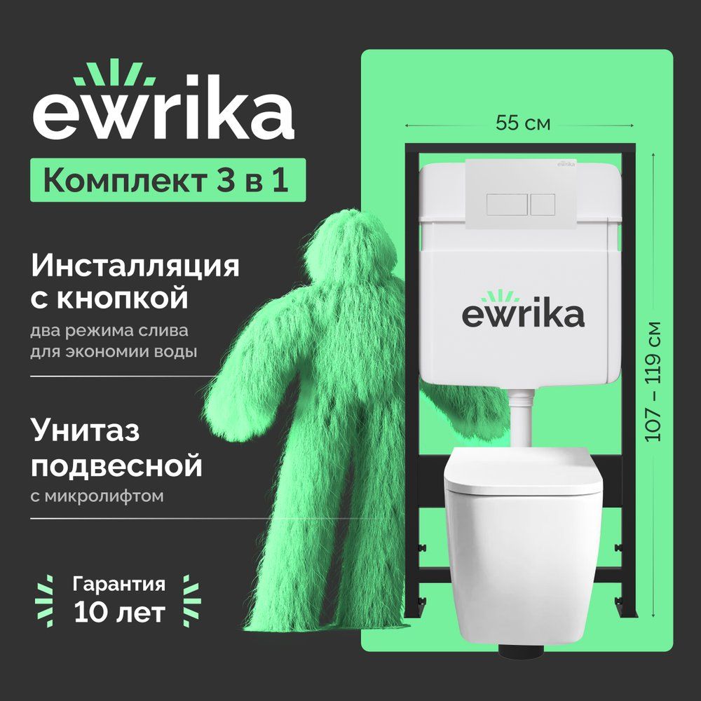 - Система инсталляции EWRIKA ProLT: крепление в капитальную стену и пол, экономный слив с двумя кнопками для различного объема. Собственное производство EWRIKA, Турция, со встроенной шумоизоляцией.
