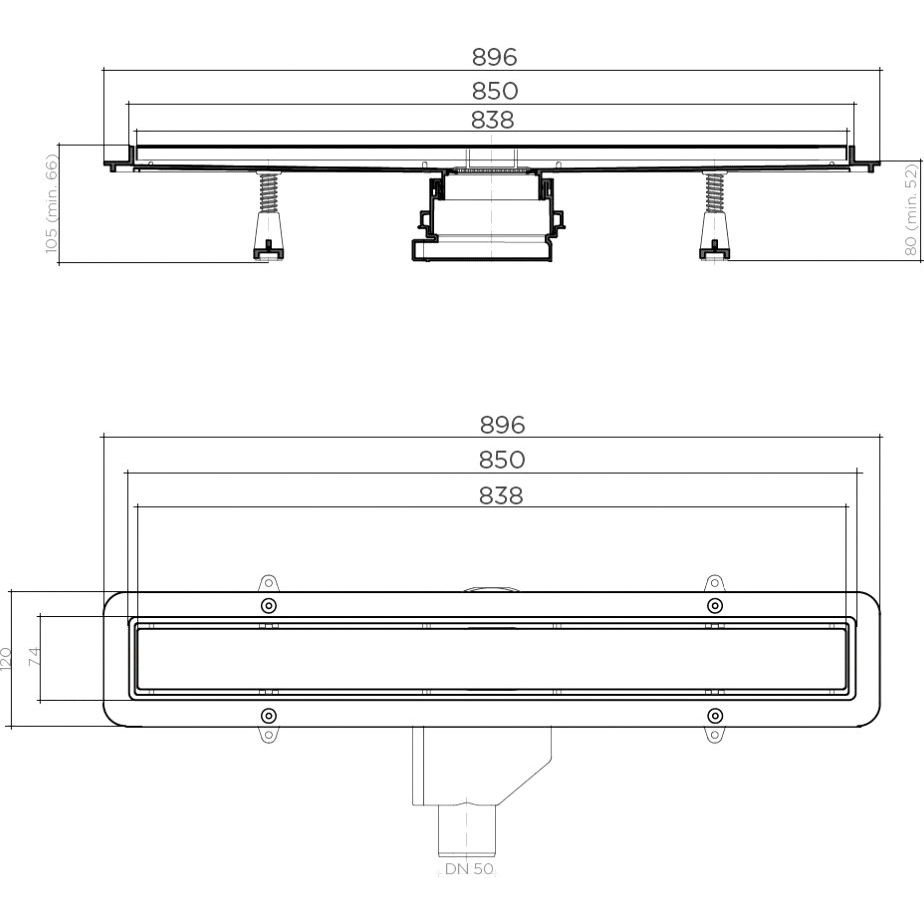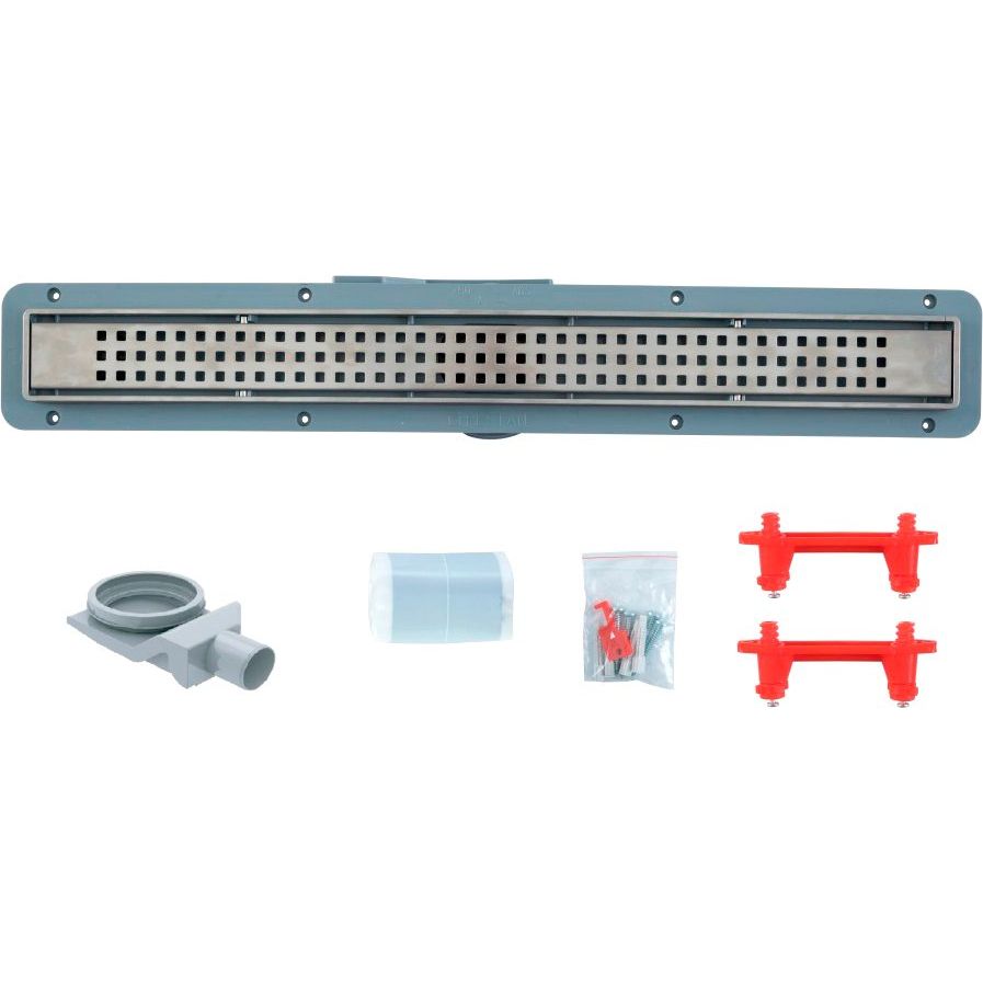 Душевой трап имеет размеры основной части 85x7,4 см и предполагает монтаж в пол, размещаясь вровень с покрытием. Боковой выпуск и комбинированный затвор позволяют оптимально подключить трап к канализационной трубе диаметром 5 см. Границы регулировки высоты составляют 4.6 см, а максимальная пропускная способность достигает 48 литров в минуту. Кроме того, трап оборудован грязеуловителем и подходит для использования с рулонными гидроизоляционными материалами. В комплект входят сифон, опоры, гидроизолирующая прокладка и уплотнительная манжета.