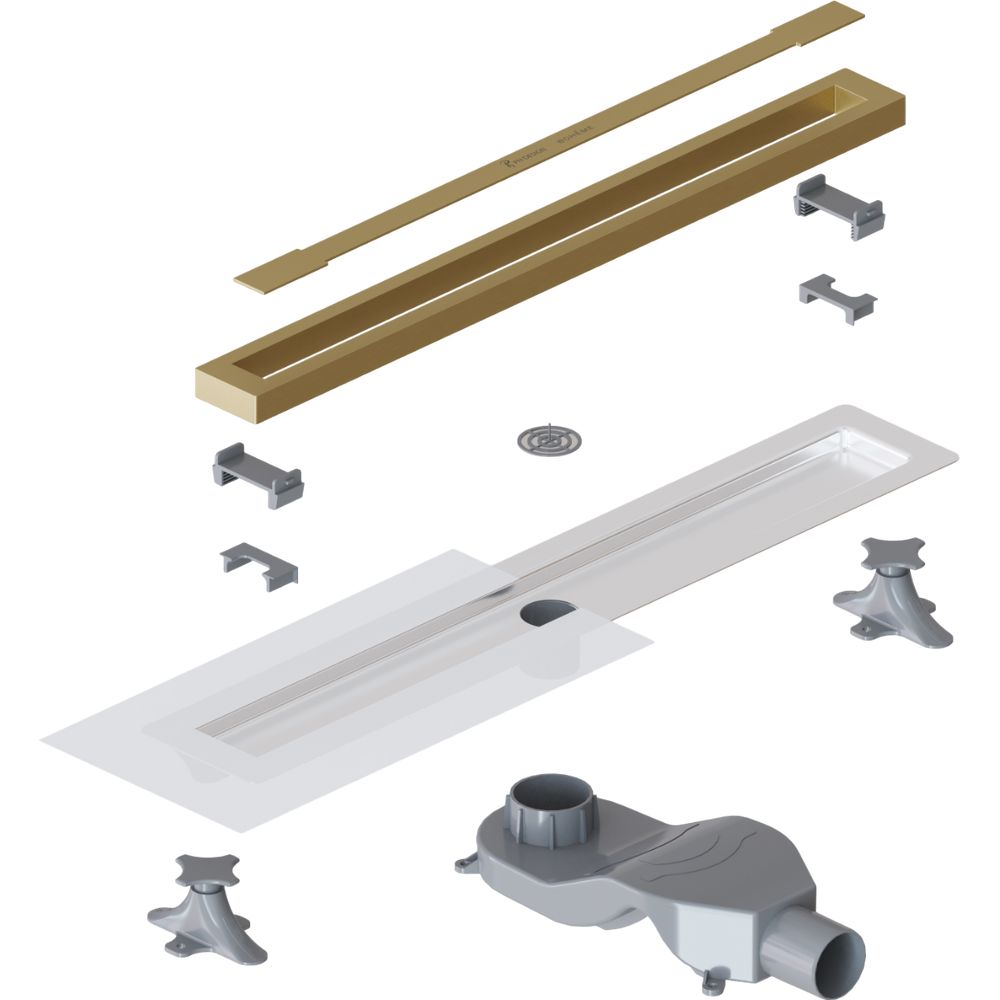 Перед установкой учтите, что для этого душевого трапа предполагается жидкий тип изоляции поверхности. Сифон уже включен в комплект поставки, а съемный гидрозатвор обеспечивает легкость в уходе за системой. Благородная отделка в матовом золоте подчеркивает статус и индивидуальный стиль вашей ванной комнаты.