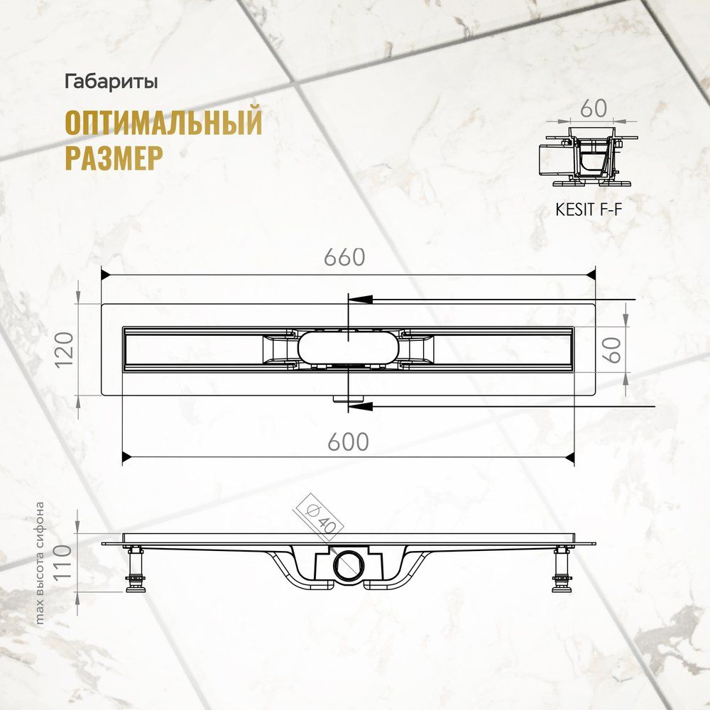Трап длиной 60 см и шириной 6 см идеально вписывается в пол, устанавливаясь вровень с поверхностью. Боковой выпуск обеспечивает удобное подключение к канализационной системе. Щелевая решетка из нержавеющей стали не только устойчива к коррозии, но и легко очищается. Диаметр слива составляет 4 см, что обеспечивает совместимость с большинством систем отвода. Пропускная способность – до 50 л/мин – делает продукт идеальным решением для современных душевых.