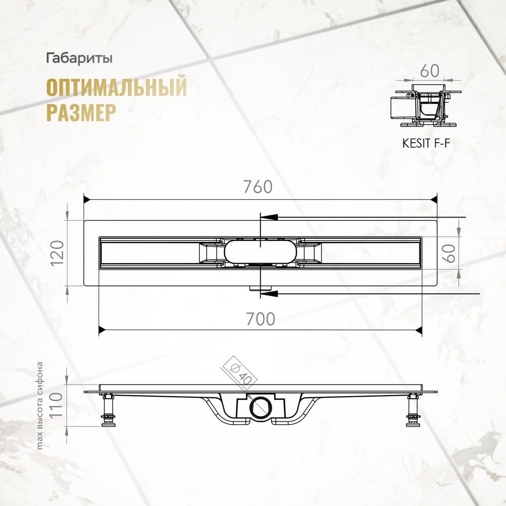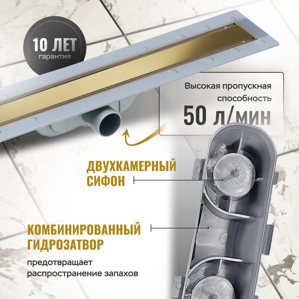 Душевой трап CK DRAIN AQCP11-70 Plain GOLD имеет длину 70 см и ширину 6 см, он легко монтируется в пол с боковым выпуском. Прорези щелевой решетки из нержавеющей стали позволяют воде быстрее стекать. Диаметр слива приспособлен для подключения к канализационной трубе 4 см. Регулирование высоты в пределах 3 см позволяет оптимально подогнать устройство под уровень пола в вашем душевом помещении. Сифон, который уже идет в комплекте, также выполнен из высококачественных материалов для максимальной долговечности изделия.