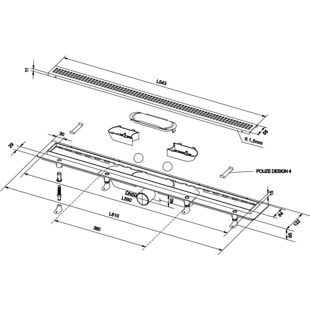 Трап устанавливается в пол и размещается вровень с ним, что позволяет сохранить гладкость поверхности и избежать выступов. Прямой выпуск и возможность выбора между мокрым или сухим затвором предотвращают распространение запахов. Преформированная решетка из нержавеющей стали не только эстетична, но и устойчива к воздействию воды. Ключевые размеры: габариты внешней части составляют 55x5,8 см, а регулируемая высота позволяет изменять уровень установки на 6 см. Диаметр слива и подключения к канализационной трубе равен 5 см.