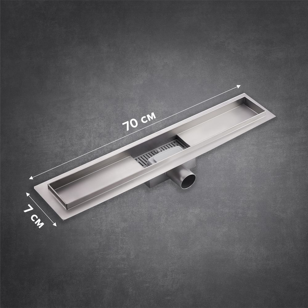 Душевой трап (лоток) РМС ТЛ-04 имеет внешний размер 70x7 см и устанавливается в пол, располагаясь вровень с покрытием. Он оснащен боковым выпуском и мокрым затвором, что обеспечивает постоянное наличие воды в сифоне. Решетка выполнена из нержавеющей стали. Высота установки регулируется в пределах 4 см, с общей монтажной высотой 12.5 см. Диаметр слива и подключения к канализационной трубе составляет 5 см. Трап гарантирует пропускную способность от 30 до 40 литров в минуту. Производится в России и сопровождается 3-летней гарантией.
