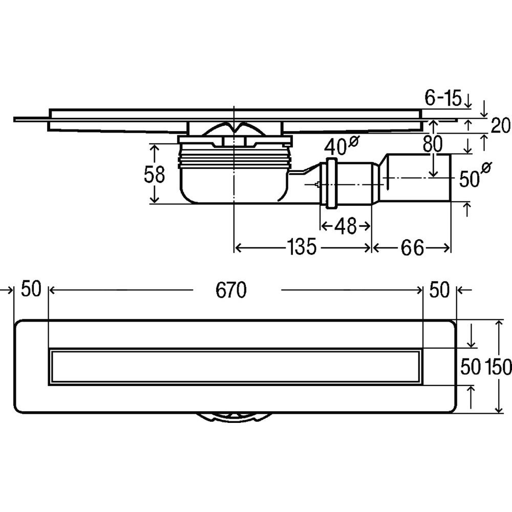 Душевой лоток имеет боковой выпуск и подключается к канализационной трубе диаметром 5 см. Габариты внешней части составляют 67x5 см, общая высота монтажа — 12 см. Решетка с щелью для воды обеспечивает быстрый отвод жидкости, а съемный гидрозатвор облегчит чистку от накопившейся грязи. В комплект входят сифон, опоры, компенсатор по высоте и фланец.