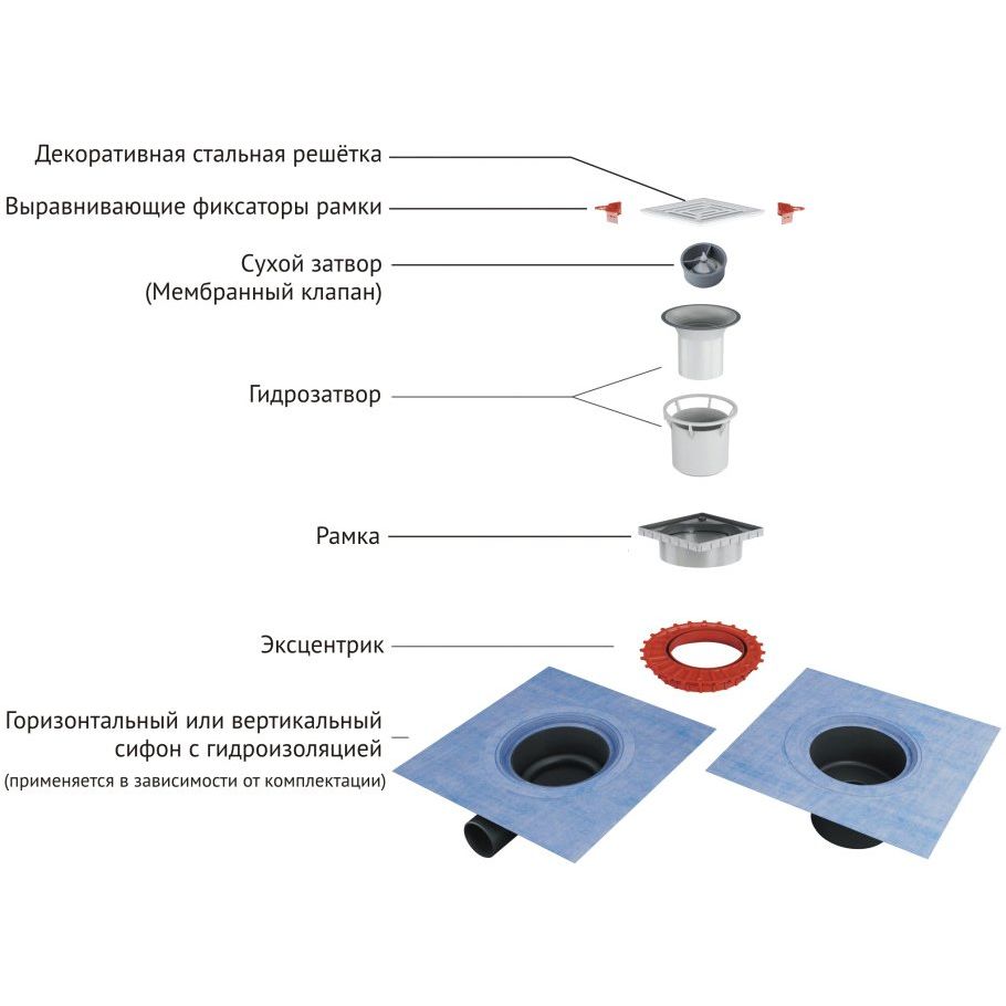 В комплект входит сифон, что упрощает процесс выбора комплектующих. Обратите внимание на необходимость учета диаметра подключаемой канализационной трубы (5 см) для обеспечения надежного подключения. Удостоверьтесь, что место монтажа позволяет регулировку трапа по высоте для оптимального размещения вровень с полом.