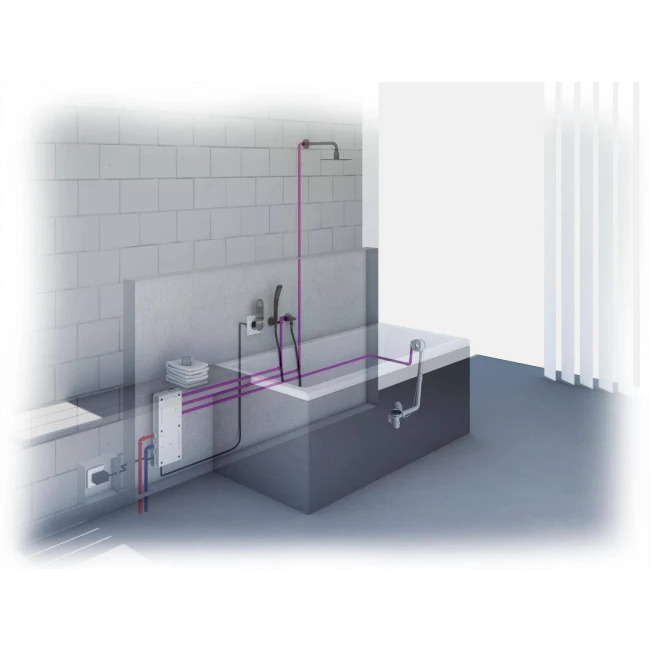 При использовании данного гарнитура наполнение ванны происходит за счет подачи воды из встраиваемого смесителя через специальное отверстие в месте расположения перелива.