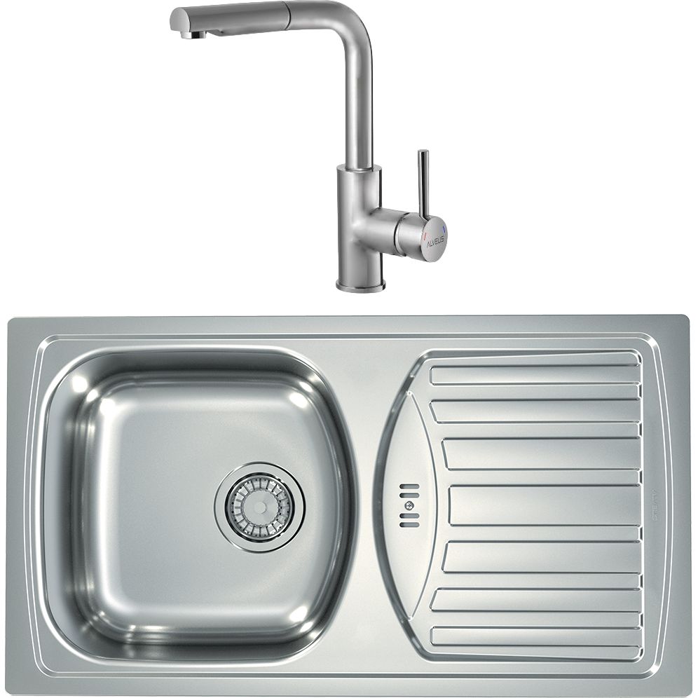 Мойка Alveus Basic 150 выполнена из нержавеющей полированной стали и встраивается выше уровня столешницы, размеры 78x43,5x14 см. Основная чаша имеет размеры 36x35,5 см и оснащена сливом-переливом с корзинчатым вентилем диаметров 9 см. Гарантия на мойку составляет 5 лет, производство — Словения. Смеситель Alveus Siros 1132901 отличается высоким качеством: высота излива — 26,8 см, длина — 20,6 см, снабжен керамическим картриджем и аэратором. Он изготовлен из матовой брашированной стали и обеспечивает быстрый монтаж с гибкой подводкой. 5-летняя гарантия также распространяется на смеситель, производитель — Словения.