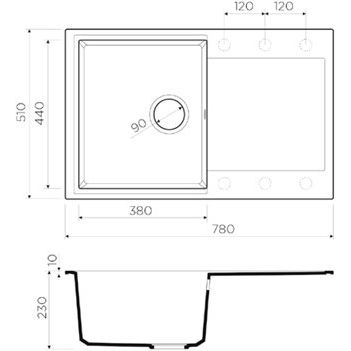 Габариты мойки: 78x51x23 см при размерах чаши 38x44 см. Мойка устанавливается над столешницей и имеет матовое покрытие. Выполнена из искусственного гранита и комплектуется слив-переливом и корзинчатым вентилем, входящими в комплект. Оснащение включает в себя сливную арматуру и сифон, а намеченные 3 отверстия позволяют установить смеситель с минимальными усилиями.