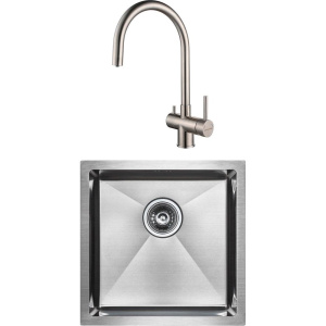 Комплект включает кухонную мойку Paulmark Gerberg PM214444-BS и смеситель Heller He213218-SS. Мойка, размером 44x44x20 см, имеет чашу 39x39 см и интегрируется как выше, так и ниже уровня столешницы. Она оснащена сливом-переливом и корзинчатым вентилем с диаметром слива 11.4 см. Поверхность из брашированной нержавеющей стали дополняется гарантией на 5 лет. Смеситель выполнен в матовом варианте с керамическим картриджем, имеет совмещенный излив для фильтрованной воды, что позволяет улучшить функциональность. Его высота излива составляет 22.7 см, а длина 21.9 см. Оснащение включает аэратор, гибкую подводку и крепления, предоставляя удобство и надежность эксплуатации.