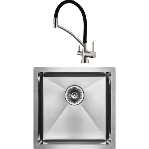 Мойка кухонная Paulmark Gerberg PM214444-BS выполнена из брашированной нержавеющей стали и имеет размеры 44x44x20 см, с чашей 39x39 см. Она может быть установлена на одном уровне со столешницей и оснащена сливом-переливом диаметром 11.4 см. В комплекте также предусмотрены корзинчатый вентиль и сливная арматура с сифоном. Смеситель для кухни Paulmark Siegen Si213111-NI имеет гибкий силиконовый излив длиной 22.5 см и высоту 24 см, что обеспечивает удобство в использовании. Изготовлен из латуни и оснащен керамическим картриджем, а также аэратором.