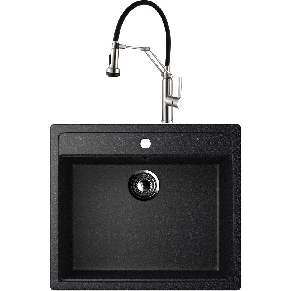 Кухонная мойка Ulgran U-104 -308 выполнена в черном цвете с габаритами 56x49,5x17,5 см и встроенной чашей размером 50x37 см. Устанавливается выше уровня столешницы и поставляется с корзинчатым вентилем и слив-переливом диаметром 9 см. Имеет одно готовое отверстие под смеситель и гарантией на 4 года. Смеситель Domaci Равенна DCB 7012, изготовленный из нержавеющей стали с гибким изливом длиной 20.2 см и высотой 22.5 см, обладает антикоррозийным покрытием и глянцевой поверхностью. Оснащен керамическим картриджем и фиксатором для лейки, а также комплектуется аэратором и гибкой подводкой. Поставляется с 5-летней гарантией.
