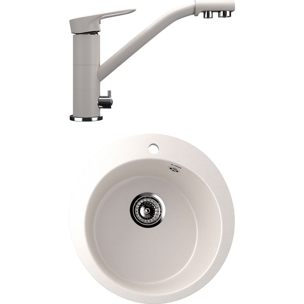 Кухонная мойка Ulgran U-405 -331 с габаритами 49,5x49,5x19 см и глубокой чашей 39,5x39,5 см, изготовлена из матового искусственного мрамора. Мойка имеет диаметр слива 9 см и комплектуется слив-переливом и корзинчатым вентилем. Смеситель Ulgran U-010 -331 белый высотой 18.2 см и длиной излива 23 см, изготовлен из латуни с керамическим картриджем. Он оснащен аэратором, защитой от обратного потока и имеет дополнительный излив для подачи фильтрованной воды.