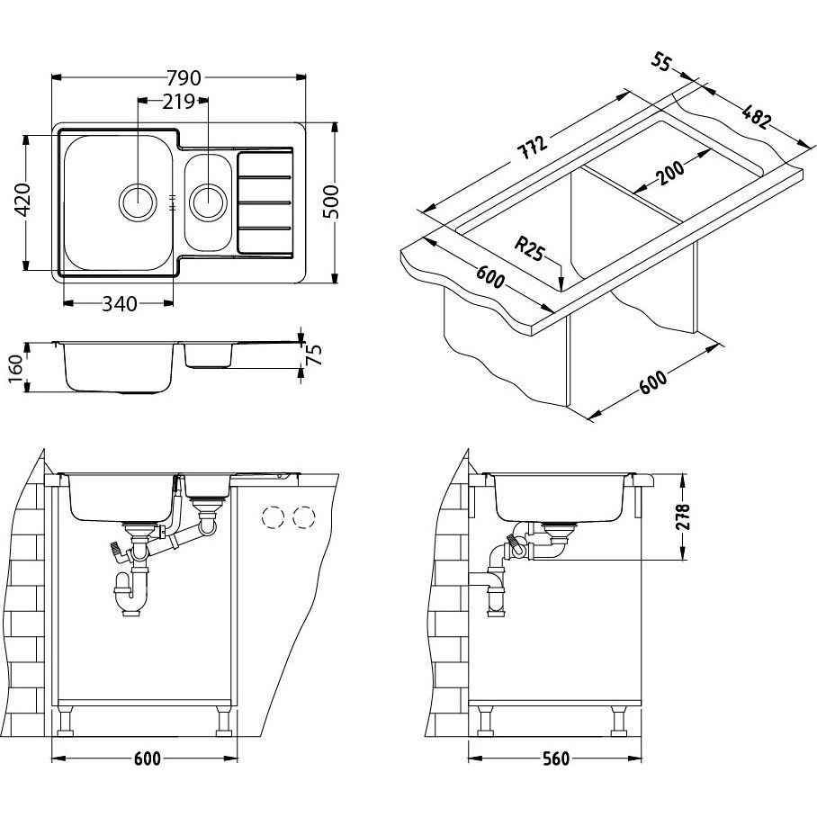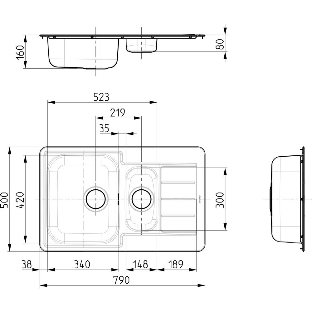 - Размеры мойки: 79x50x16 см, размеры основной чаши: 34x42 см