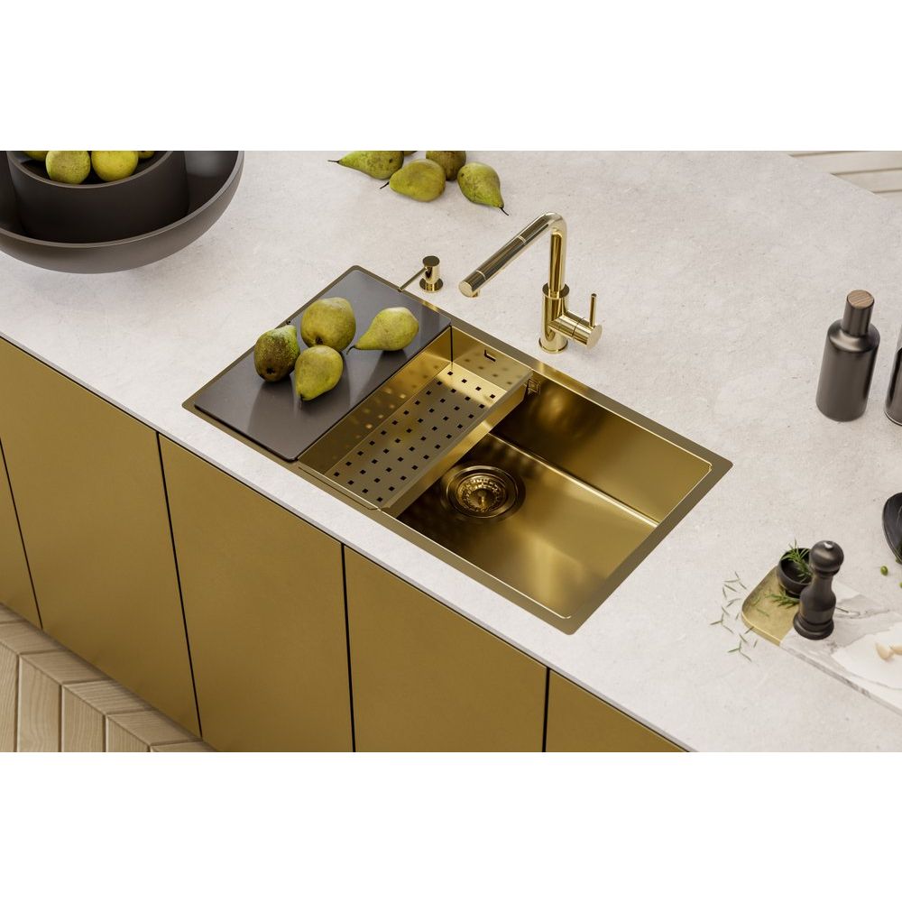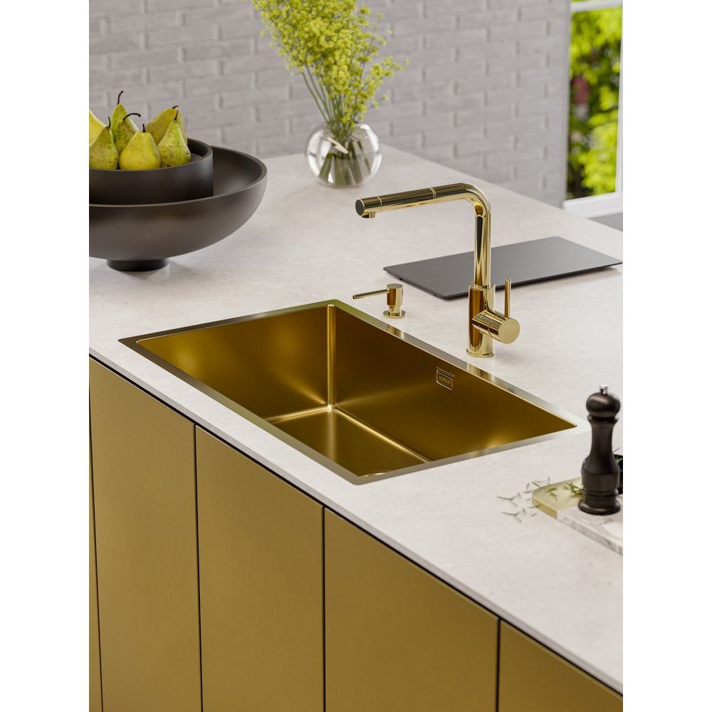 Кухонная мойка Alveus Quadrix Monarch 60 в роскошном бронзовом исполнении представляет собой идеальное решение для современных кухонь. Она отличается практичностью и продуманностью: широкая конструкция позволяет с комфортом мыть габаритные кастрюли и сковороды, а оптимальная глубина предотвращает образование брызг. Мойка изготовлена из высококачественной нержавеющей стали марки AISI 304, покрытой бронзовым PVD, что не только придаёт ей элегантный блеск, но и делает устойчивой к коррозии и механическим повреждениям. Гладкая поверхность и скругленные углы облегчают уход и поддержание чистоты.