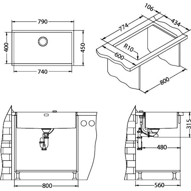 Габариты мойки составляют 79x45x20 см, вмещающая чаша 74x40 см. Удобная интеграция в кухонное пространство возможна благодаря универсальной конструкции, которая позволяет встраивать мойку выше, ниже столешницы или на одном уровне с ней. Металл мойки - нержавеющая сталь, поверхность полированная для дополнительной стойкости. Мойка оснащена сливной арматурой, включая слив-перелив и корзинчатый вентиль диаметром 9 см, без готовых отверстий. На изделие распространяется гарантия сроком 5 лет. Страна производства — Словения.