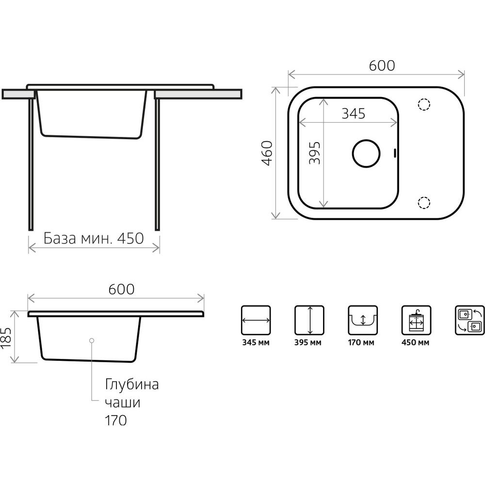 Габариты мойки составляют 60x46x18,5 см, а чаша имеет размеры 34,5x39,5 см, что гарантирует вместительность и удобство в использовании. Установка предусматривает встраивание выше уровня столешницы, что облегчает уборку. Диаметр сливного отверстия - 9 см, а наличие двух намеченных отверстий под смеситель позволяет адаптировать мойку под ваши нужды.