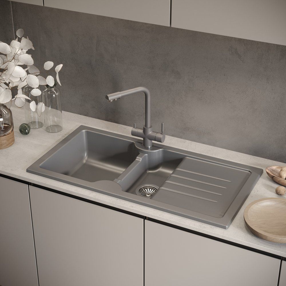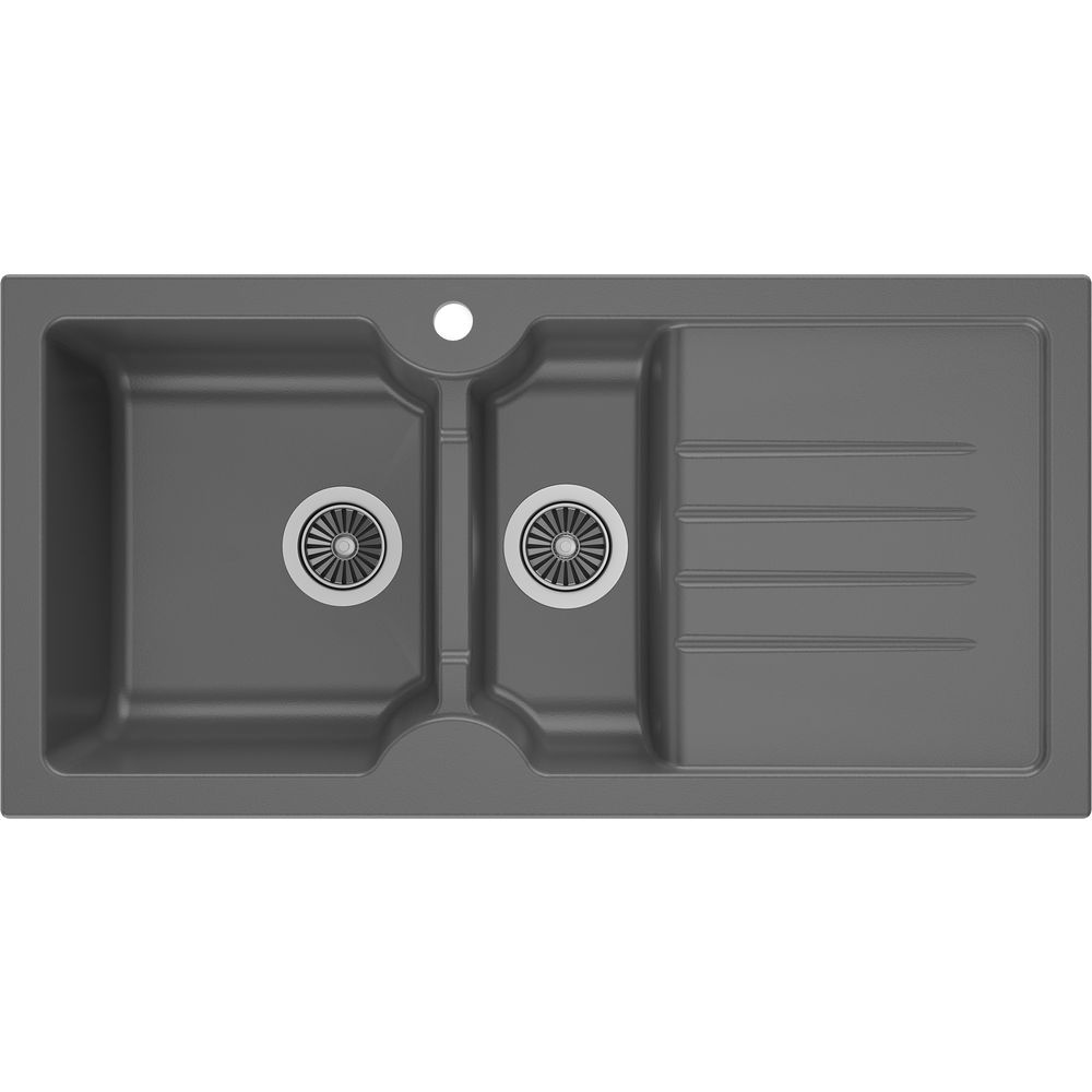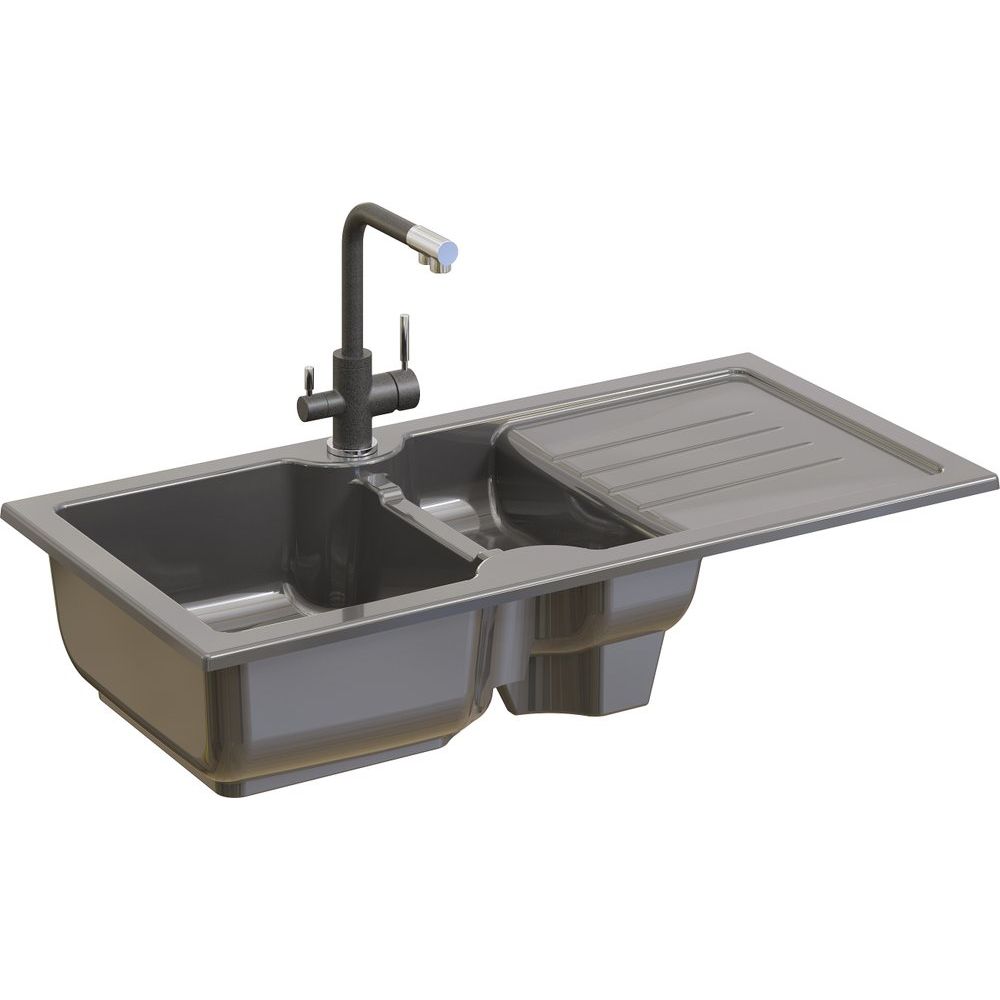 Габариты мойки составляют 100x50x19,5 см, а габариты чаши — 36x41 см. Конструкция предусматривает встраивание выше уровня столешницы, что придаёт дополнительное удобство при эксплуатации. Единственное отверстие под смеситель уже подготовлено. Слив с перегородкой можно приобрести отдельно — диаметр отверстия составляет 9 см. Эта модель не предусматривает установку слива-перелива и выполнена в матовом антраците.