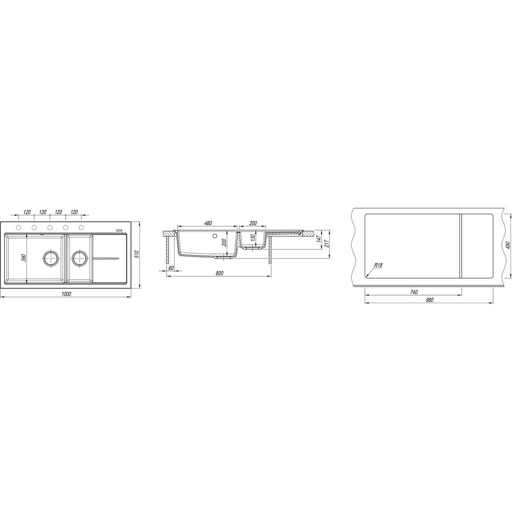 Мойка имеет размеры 100x51x21,7 см, а чаша — 46x39 см и предназначена для установки выше уровня столешницы. Изготовленная из матового кварца, эта кухонная мойка оснащена системой слив-перелив, сифон и разделочная доска входят в комплект. Диаметр слива составляет 9 см. Для большего удобства, предусмотрены 5 намеченных отверстий для установки смесителя. Производитель предоставляет 5 лет гарантии на изделие.