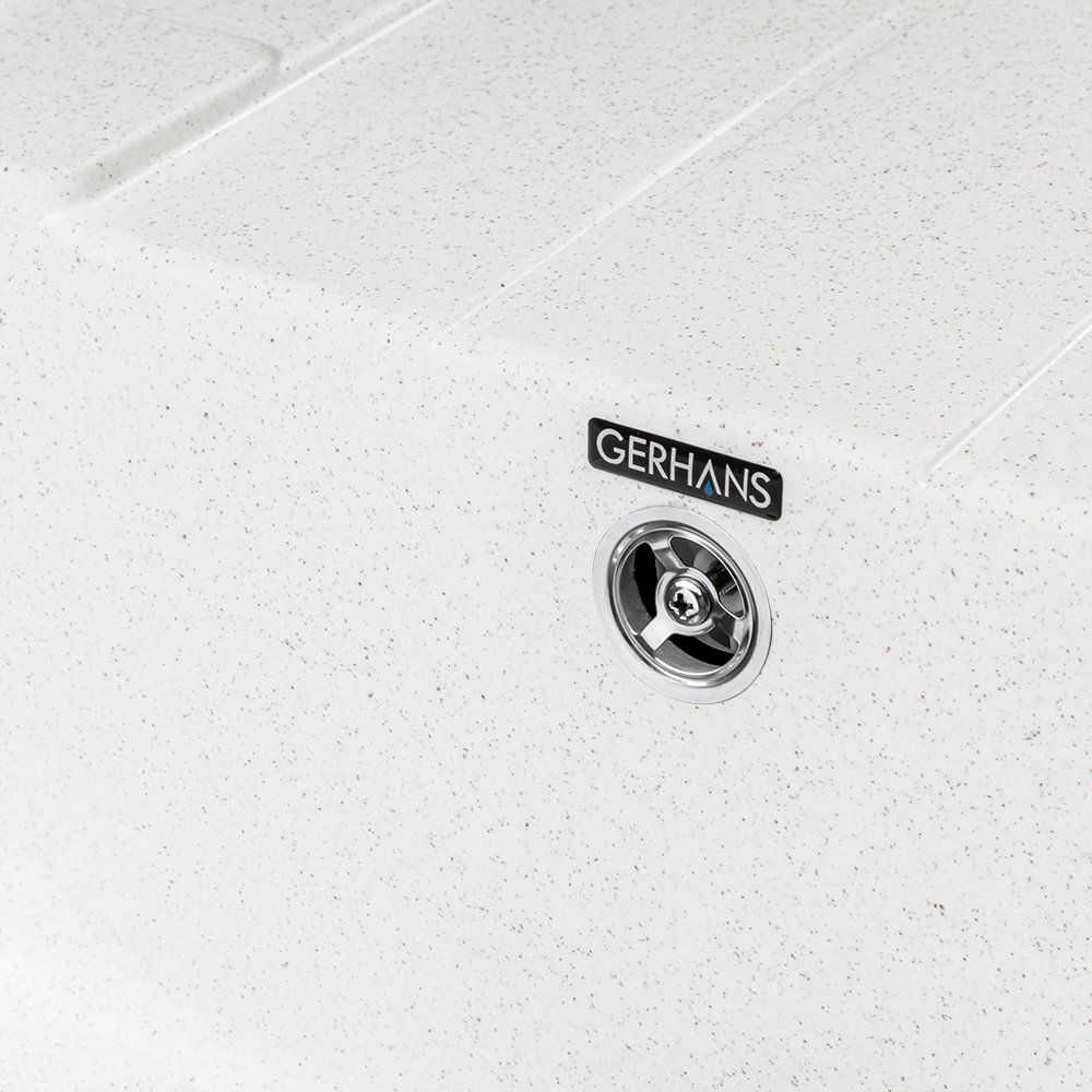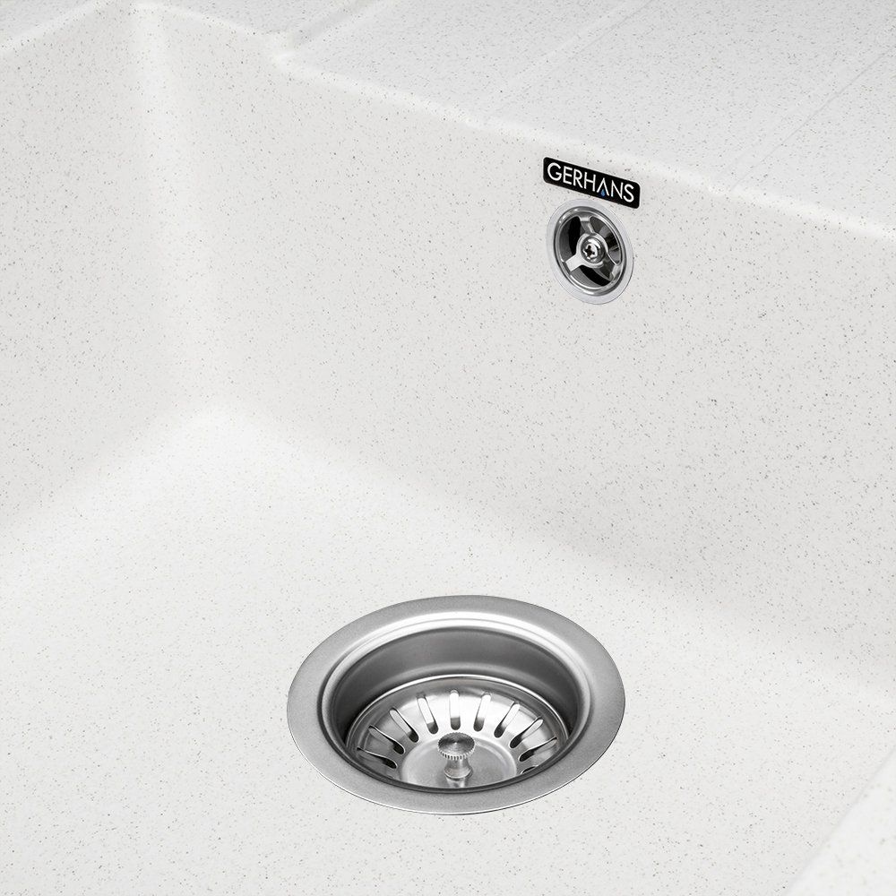 Кухонная мойка Gerhans B22-18 в белоснежном оттенке представляет собой идеальное сочетание стиля и практичности. Она изготовлена из высококачественного искусственного гранита, что гарантирует долговечность и высокую устойчивость к термоудару до 180 градусов. Благодаря своей особой структуре мойка не впитывает пищевые красители и защищена от микро-царапин, ультрафиолетового излучения, грибковых поражений и неприятных запахов. Дополнительное пространственное армирование обеспечивает прочность и надежность конструкции, а низкое температурное расширение исключает подвижность на столешнице, сохраняя идеальную гидроизоляцию.