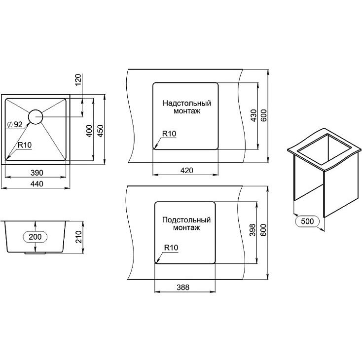 Размеры мойки составляют 44x45x21 см, а размеры чаши - 41x40 см, что обеспечивает достаточно пространства для мытья посуды. Комплектуется корзинчатым вентилем и сливной арматурой, диаметр слива равен 9.2 см. Мойка не имеет готовых отверстий для смесителя, сохраняя целостность и современный вид.