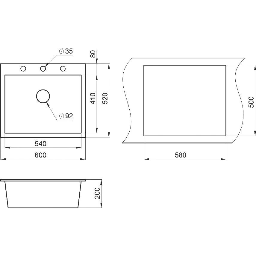 Мойка имеет размеры 60x52x20 см, с чашей 54x41 см, что обеспечивает вместительность для повседневного использования. Она встраивается выше уровня столешницы, что упрощает установку и добавляет удобства в повседневном использовании. В комплект входят сливная арматура и сифон, поэтому вам не нужно будет заботиться о дополнительных покупках. Диаметр слива составляет 9.2 см, обеспечивая быстрый отвод воды.