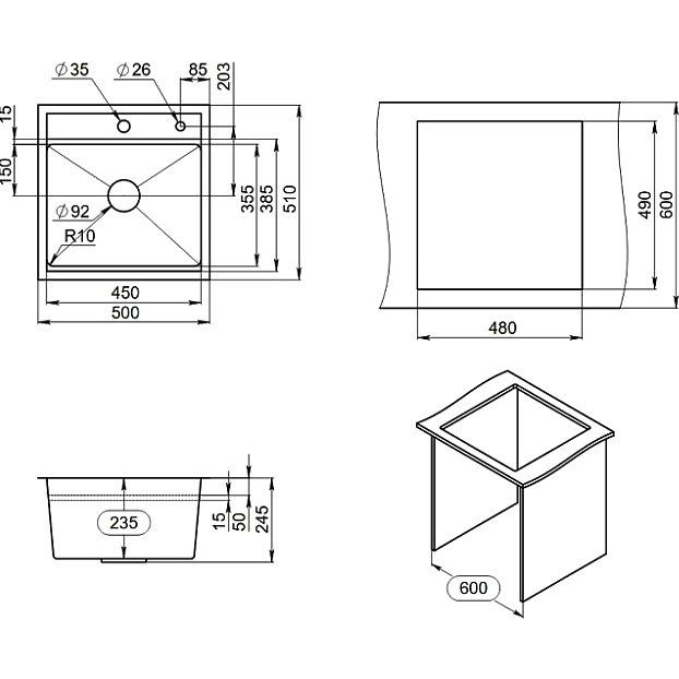 Кухонная мойка размером 50x51x24,5 см имеет внушительную чашу 45x48 см для комфортного мытья посуды. Она встраивается выше уровня столешницы, что облегчает уход за столом и предотвращает попадание воды. Диаметр слива составляет 9,2 см, а встроенный корзинчатый вентиль обеспечивает удобный сток воды. Также мойка имеет одно готовое отверстие под смеситель.