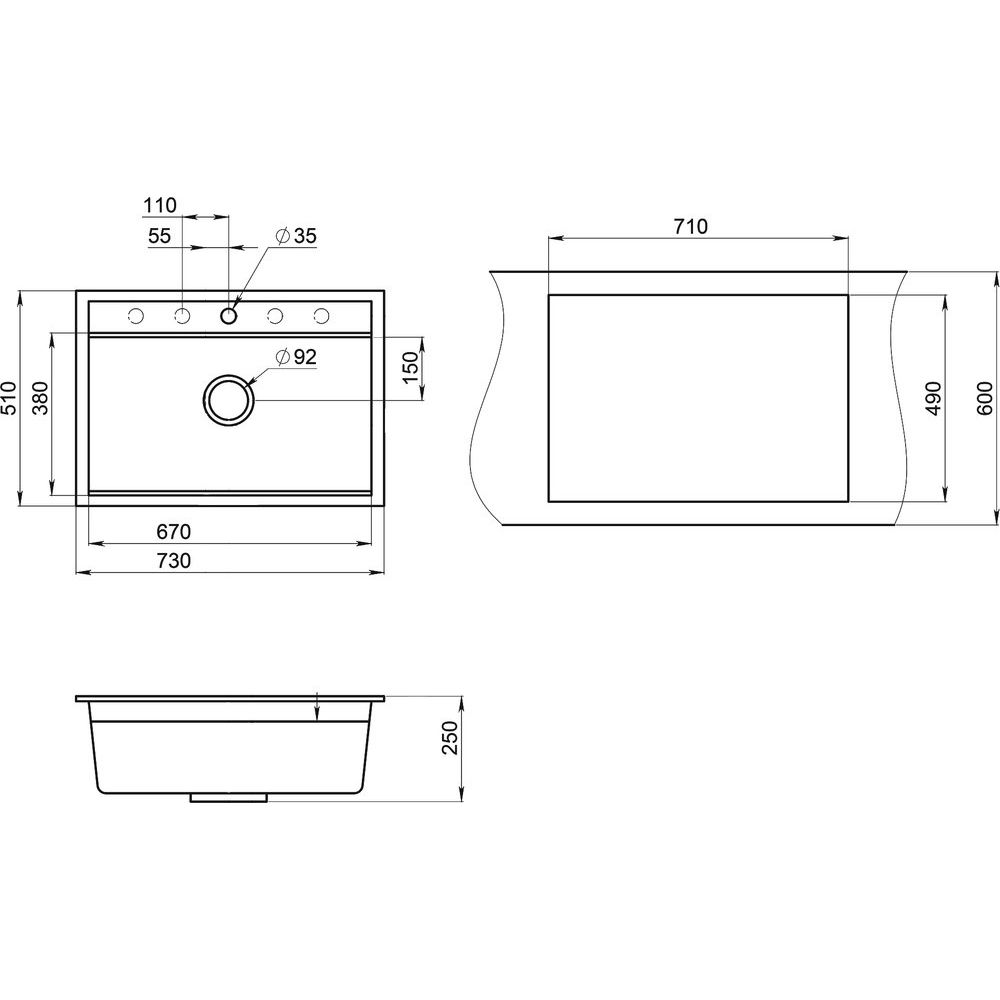 Мойка кухонная Granula Kitchen Space 7301 имеет размеры 73x51x25 см, что идеально подходит для любой кухни. Вместительная чаша 67x38 см обеспечивает комфортное мытьё даже больших кастрюль и противней. Мойка встраивается выше уровня столешницы и имеет диаметр слива 9 см. В комплекте - сливная арматура, сифон, сушилка ролл-мат и дозатор. Возможность установки пяти дополнительных отверстий под смеситель добавляет гибкости в планировании кухни.