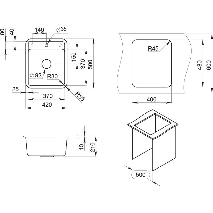 Мойка имеет габариты 42x50x21 см и просторную чашу размером 37x37 см. Диаметр слива 9.2 см соответствует большинству современных стандартов. Конструкция включает одно готовое и два намеченных отверстия под смеситель, что позволяет настраивать мойку под индивидуальные предпочтения. Обратите внимание, что слив-перелив и корзинчатый вентиль приобретаются отдельно. Модель произведена в России и предоставляется с гарантией на 2 года.