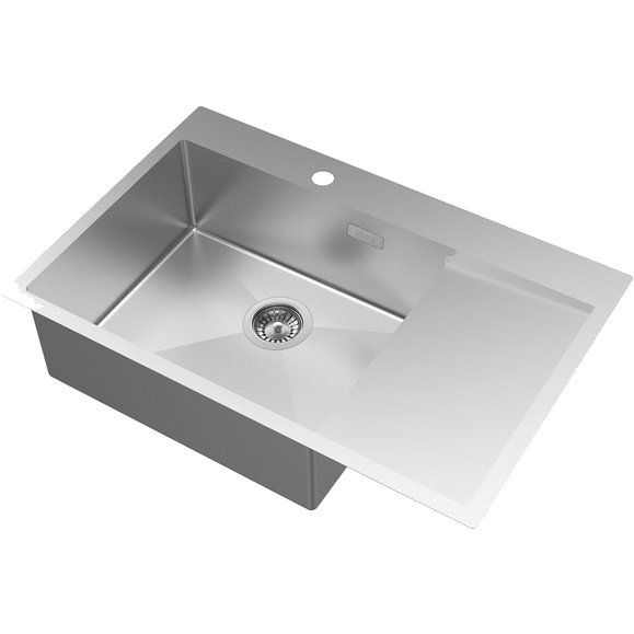 Мойка имеет габариты 78x51x21 см, с чашей размером 50x40 см, что обеспечивает достаточное пространство для мытья посуды и обработки продуктов. Она встраивается выше уровня столешницы, что упрощает установку. Диаметр слива составляет 9 см, и мойка оснащена одним готовым отверстием под смеситель.