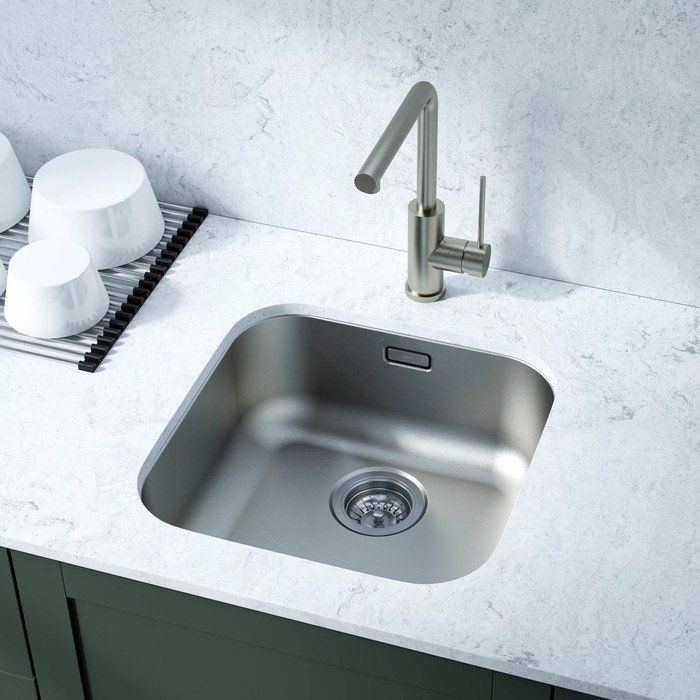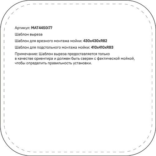 Эта модель выполнена из высококачественной матовой нержавеющей стали, которая придаёт кухне современный вид и сохраняет свою привлекательность долгие годы. Размеры мойки составляют 44,6x44,6x18 см, а размеры чаши — 40,6x40,6 см, что позволяет максимально удобно использовать пространство. Мойка может быть встраиваемой как выше, так и ниже уровня столешницы, предоставляя больше гибкости в дизайне интерьера. В комплекте предусмотрен набор для монтажа, включая сливную арматуру и сифон с корзинчатым вентилем диаметром 9 см, подходящий для стандартных кухонных систем. Отверстия для установки смесителя не предусматриваются, что расширяет варианты выбора.