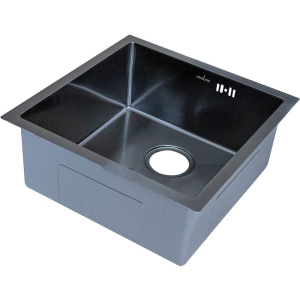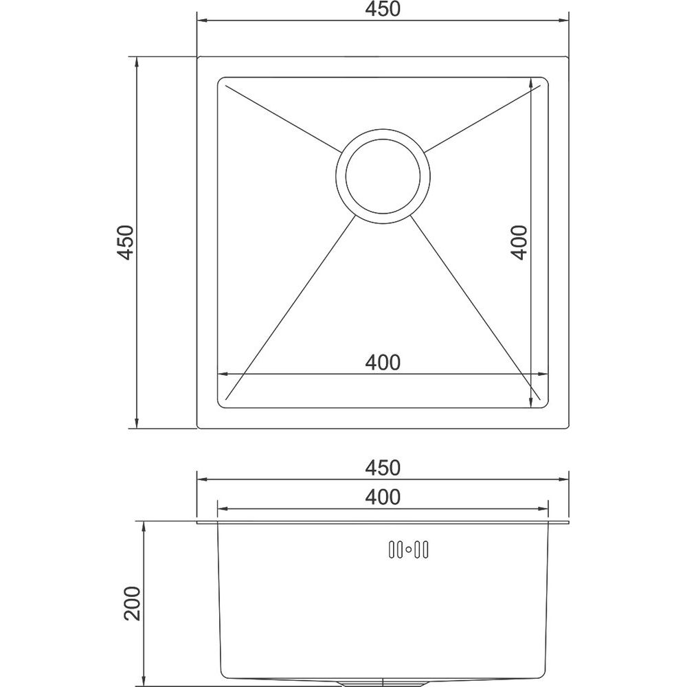 Мойка имеет компактные размеры 45x45x20 см, что делает ее идеальной для небольших кухонь. Размеры чаши составляют 40x40 см, обеспечивая достаточное пространство для мытья посуды. В центре удобный слив диаметром 9 см. В комплекте модель идет без готовых отверстий, что даёт возможность адаптировать установку под индивидуальные нужды. Дополнительно в комплект входит вся необходимая сливная арматура, включая сифон, что избавляет от необходимости покупки дополнительных аксессуаров.