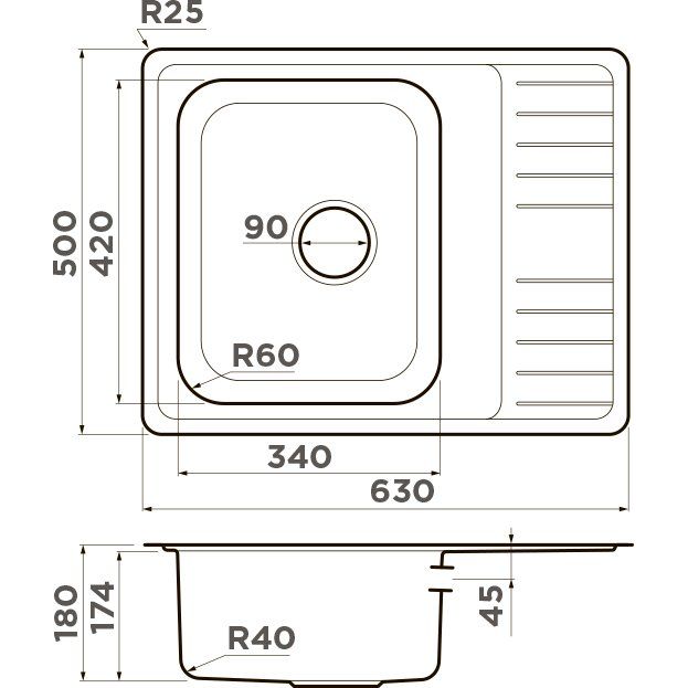 Мойка Omoikiri Sagami 63 имеет габариты 63x50x18 см и чашу размером 34x42 см, что делает её идеальной для повседневного использования. Мойка устанавливается выше уровня столешницы и выполнена из брашированной нержавеющей стали. В комплекте идет слив-перелив, корзинчатый вентиль, а также полная сливная арматура, уплотнительная прокладка и сифон с диаметром слива 9 см. Мойка не имеет готовых отверстий, что позволяет сохранить её эстетичный вид.