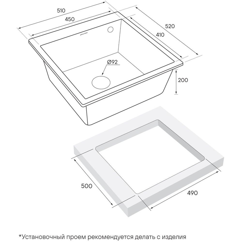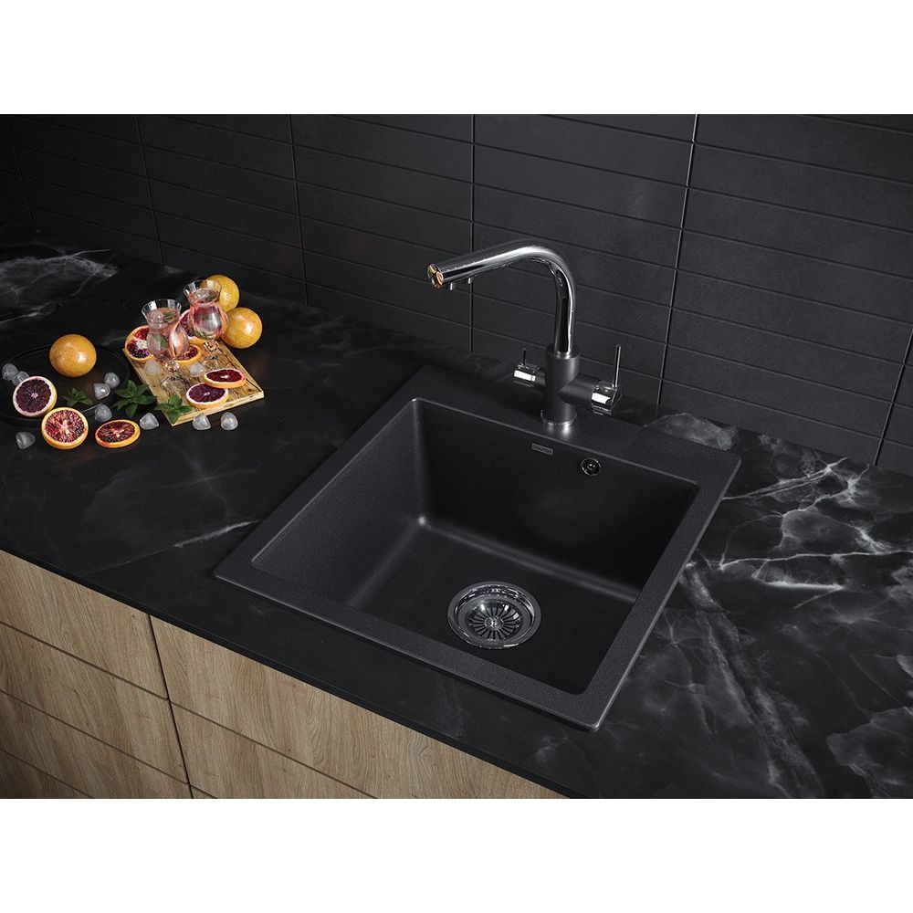 Мойка размером 51x52x20 см идеально подходит для стандартных кухонных гарнитуров и устанавливается выше уровня столешницы, что облегчает доступ и уход. Размеры чаши — 46x42 см — обеспечивают достаточную вместительность. Изготовленная из матового искусственного гранита, она оснащена сливом-переливом с диаметром слива 9.2 см и корзинчатым вентилем. В комплекте нет готовых отверстий, поэтому вы сможете самостоятельно выбрать оптимальное расположение крана.