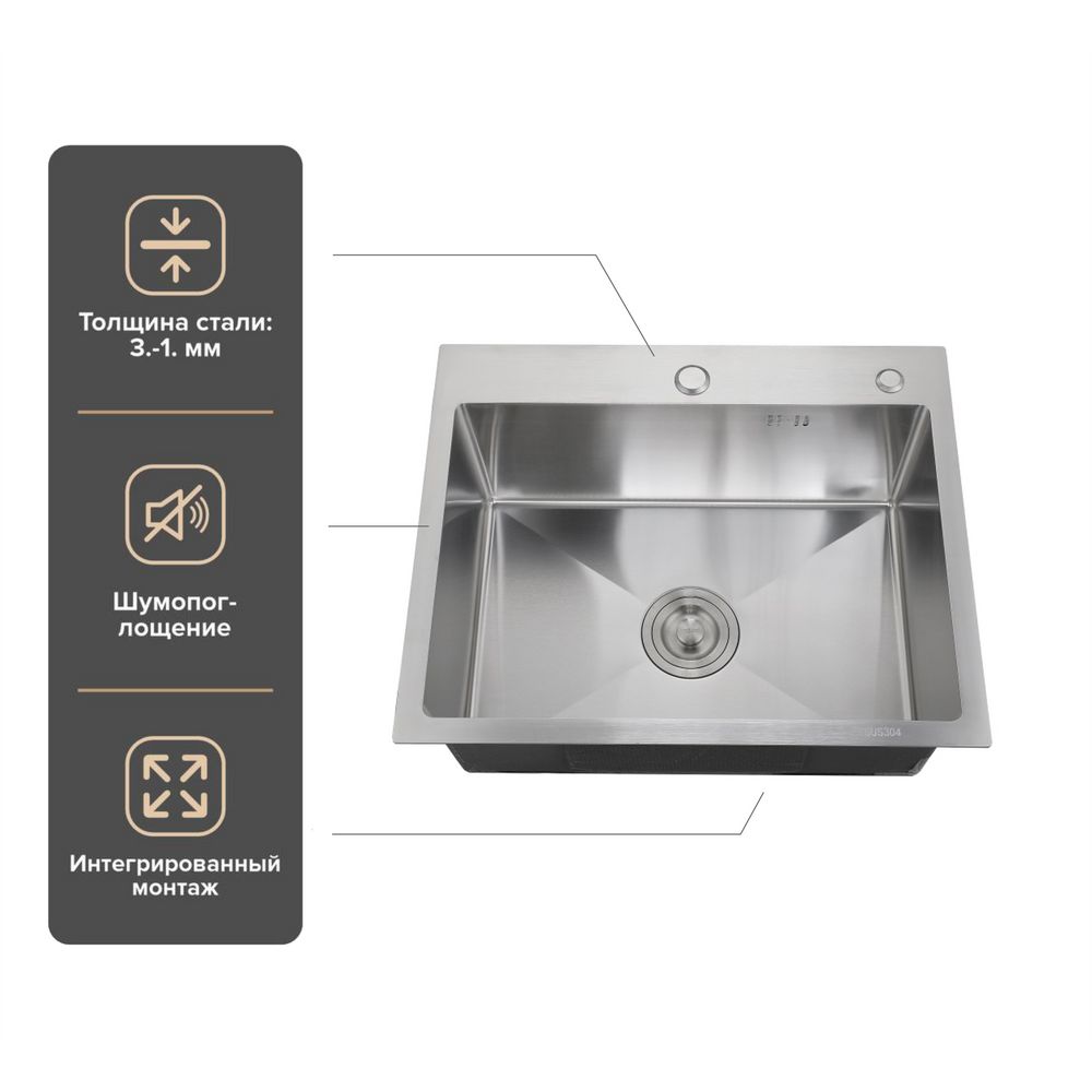 Мойка размером 50x50x20 см идеально подходит для большинства кухонь. Габариты чаши составляют 45x40 см, обеспечивая простор для работы даже при интенсивном использовании. Изделие оснащено сливом-переливом, корзинчатым вентилем и имеет диаметр слива 11 см. Предусмотрено одно отверстие под смеситель, а комплект из слива, сифона, заглушки и дозатора упрощает установку и использование. Гарантия на изделие составляет 4 года, и оно произведено в России.