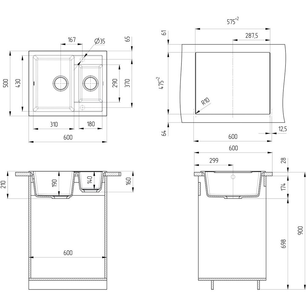 Мойка имеет размеры 60x48,5x19 см, а чаша — 33x41 см, что позволяет ей гармонично встраиваться над уровнем столешницы. Изготовленная из матового искусственного мрамора, мойка дополнена сливом-переливом и корзинчатым вентилем в комплекте. Диаметр слива составляет 9 см. В изделии не предусмотрены готовые отверстия, что позволяет настроить установку по вашему усмотрению. Производится в России и идет с гарантией на 4 года.