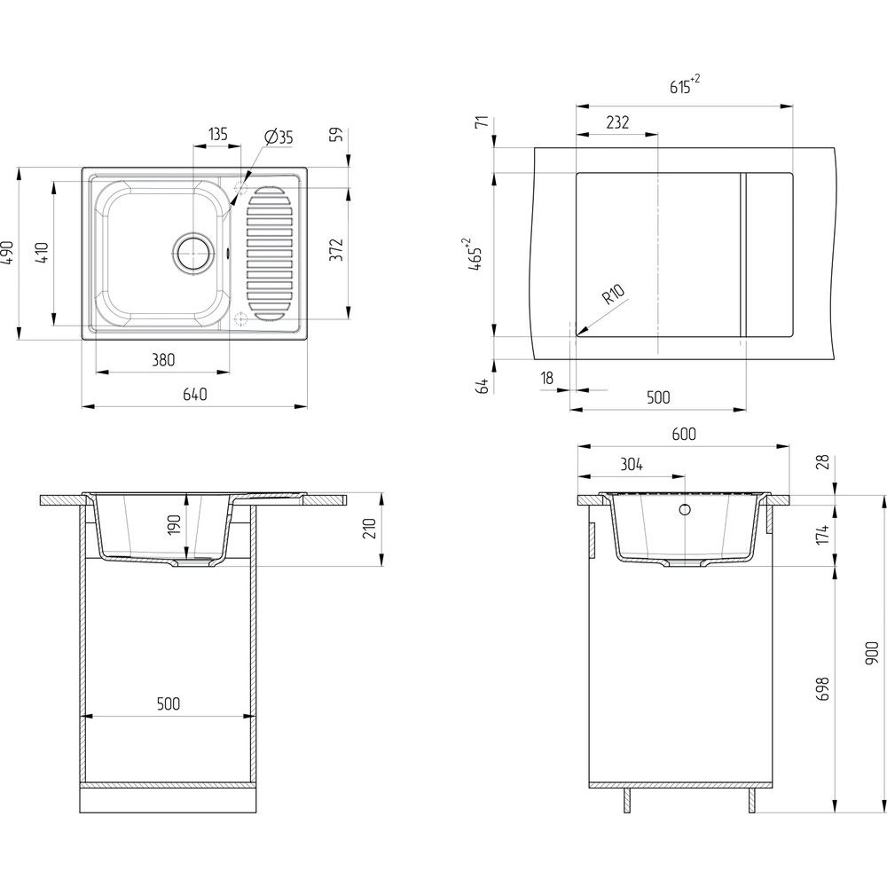 Мойка имеет габариты 64x49x19 см, а чаша — 37x40 см, что делает ее удобной и вместительной. Она встраивается выше уровня столешницы и оборудована сливной арматурой с корзинчатым вентилем и слив-переливом. Диаметр отверстия слива составляет 9 см. В комплекте отсутствуют готовые отверстия, что позволяет индивидуально определять размещение смесителя. Гарантия на изделие составляет 4 года, страна производства — Россия.