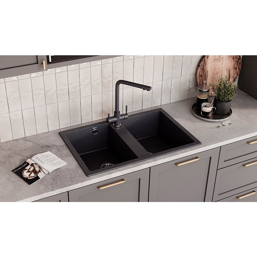 Мойка имеет габариты 77x50x19 см, а ее чаша — 31,5x44 см. Продуманная конструкция позволяет встраивать мойку выше уровня столешницы, что упрощает установку и уход. Матовая поверхность и антрацитовый оттенок обеспечивают мойке стильный внешний вид. В комплекте предусмотрена сливная арматура и сифон, что облегчает монтаж и подключение. Дополнительные удобства включают слив-перелив и корзинчатый вентиль с диаметром слива 9 см.